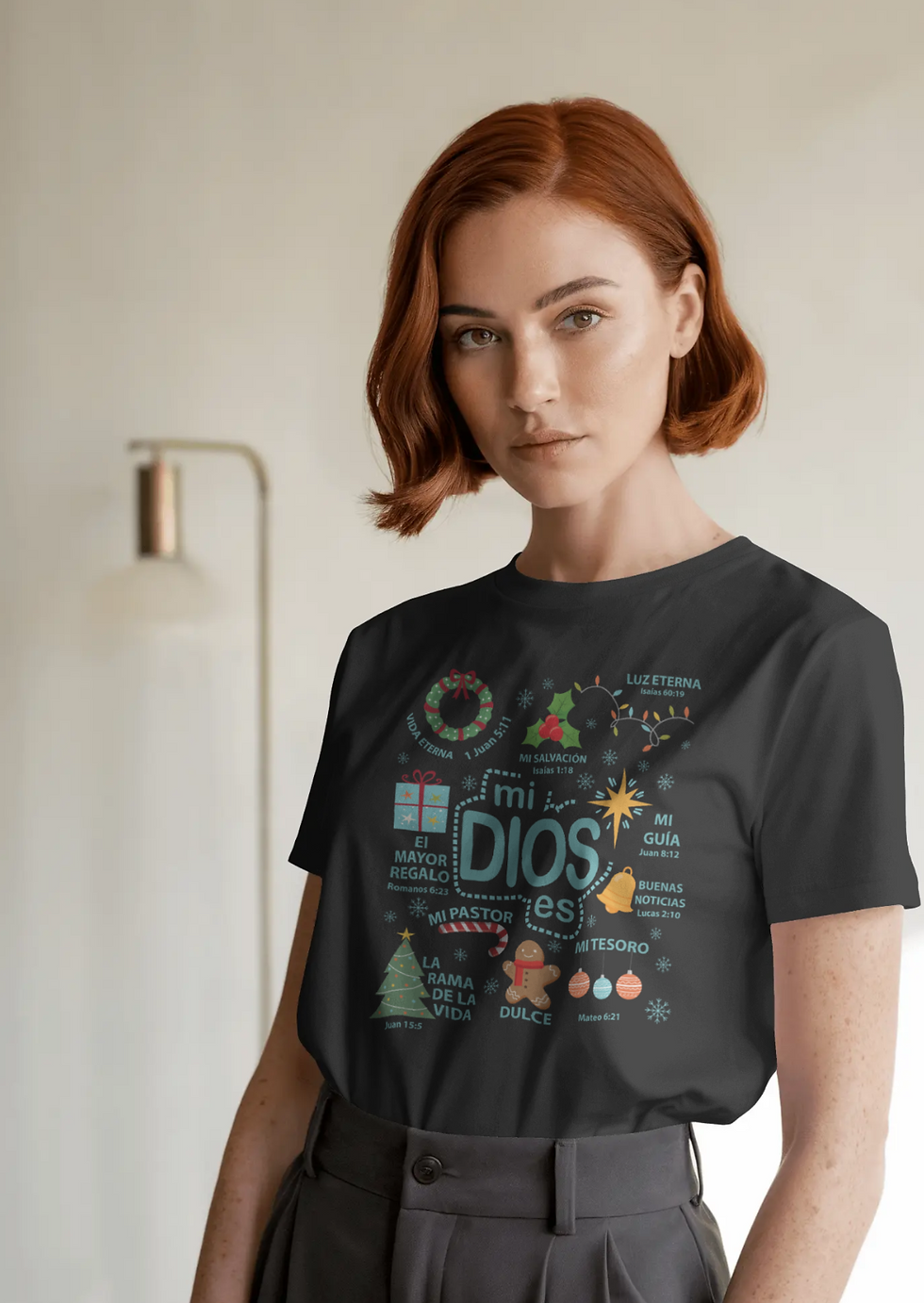 Un diseño lleno de elementos navideños y versículos que describen quién es nuestro Dios. Una pieza visualmente llamativa y espiritualmente profunda para llevar su verdad a donde vayas.